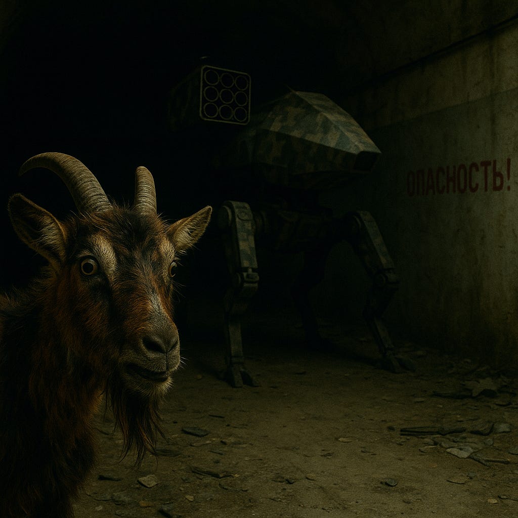 ‘It’s true,’ said Frosty. ‘Mebbe the AI’s prompt exempted goats from its targeting package?’
